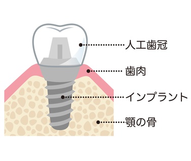 インプラント治療では、欠損した部位の顎の骨にインプラント体と呼ばれる歯の根っこに相当するものを直接埋め込みます。そのため、噛んだ時の感覚が自然な状態に近いといわれています。