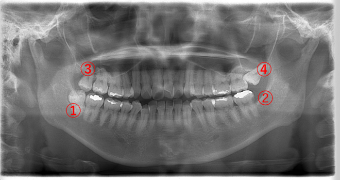 まず、画像:①と②の親知らずを抜き、③と④の親知らずは生えてから抜くという手順になりました。