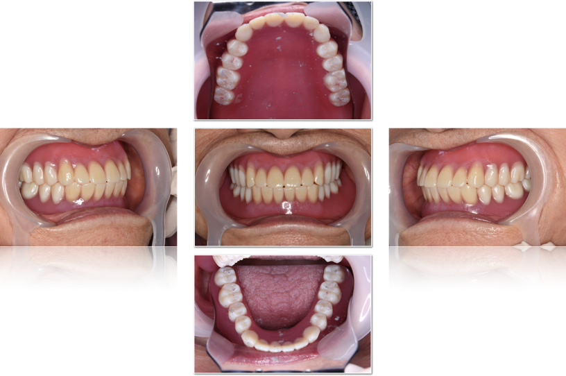 治療用義歯の完成になります。上下左右ともにしっかりと噛んでいます。お口の中に入れてかみ合わせを調整して、セットしました。