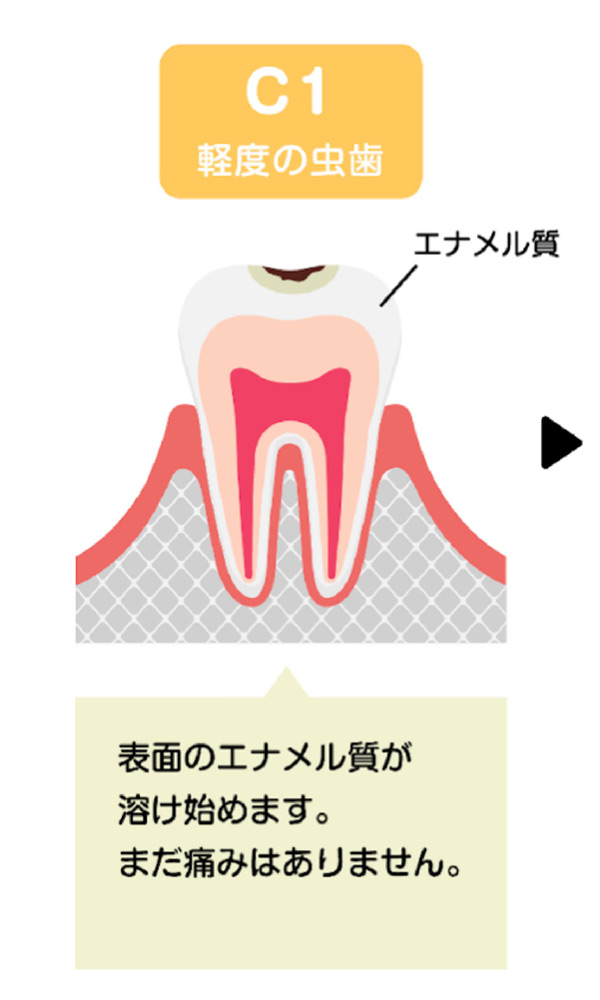 C1は、エナメル質内の虫歯になります。そのため、積極的に削って詰めるという治療を行うことはしません。 どちらかというとC0の治療に近い方法をとります。削るのではなく、それ以上虫歯が進まないようにフッ素やMIペーストを塗布します。 虫歯を削ってプラスティックの詰め物をします。虫歯の大きさや深さによって治療回数や虫歯の治療費が変わることがあります。