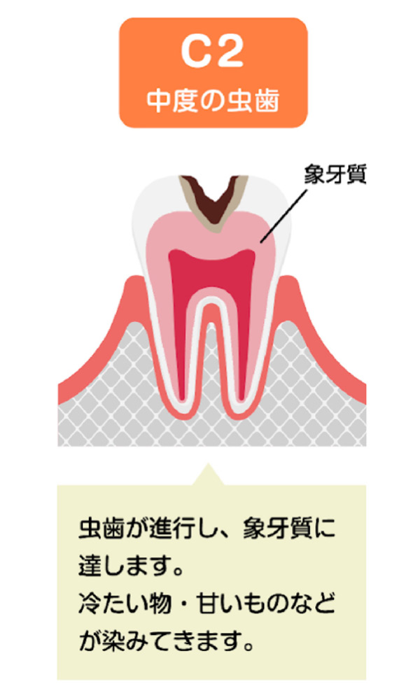 C2は、象牙質まで虫歯が達しているケースになります。象牙質は、エナメル質に比べて柔らかいですので、虫歯の進行も早いです。 そのため、削って詰めるという治療が必要になります。| 内容 | 費用 |