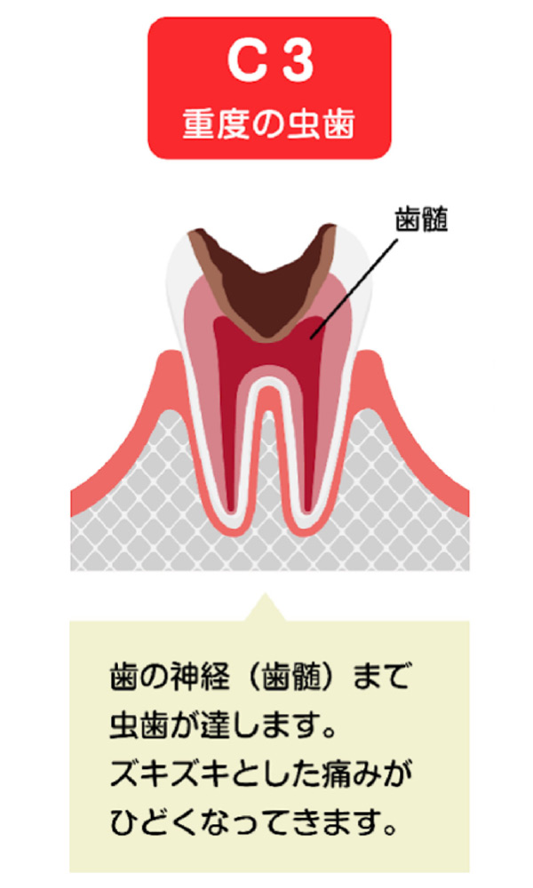 C3の虫歯は、「神経に達するかどうかの虫歯」になり、多くの場合は神経の治療が必要となります。 神経を残すという治療も最近では増えていますが、初めはどうしても噛んで痛いとかしみるという症状が出てしまいます。 患者さんの中は「虫歯が残っているのではないか」と不安になられる方もいらっしゃいますので、多くの場合、神経の治療もオススメしております。