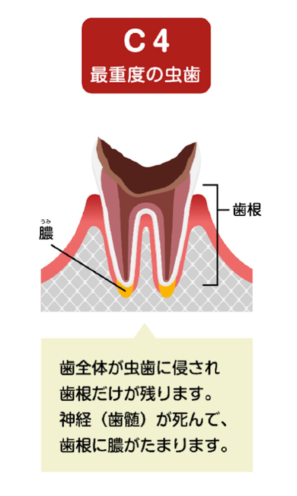 C4の虫歯は、ほとんどのケースが抜歯となります。まれに硬い歯の部分が残っており、矯正などの力を加えて歯を残すという治療が可能な場合がありますが、基本的には抜歯となります。 抜歯後の治療としては、ブリッジ、入れ歯、インプラントがあります。 ブリッジと入れ歯は、保険内治療ができますが、インプラントは保険外治療になります。