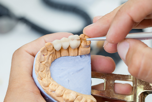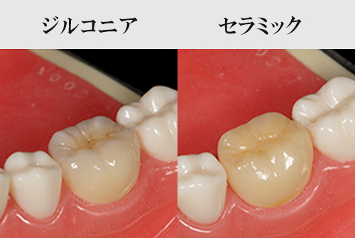 ジルコニアは強度の面から、食べ物を奥歯での噛み砕くなどの負担に向いています。見た目は単色ですが、通常はあまり目立たない奥歯に使用されるため、審美的な面での問題はほとんどありません。