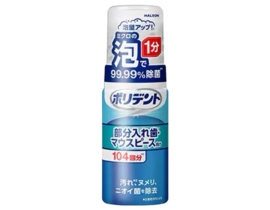 1分で臭い菌を99.99%除菌します。研磨剤不使用なので、部分入れ歯やマウスピースを傷つけません。
