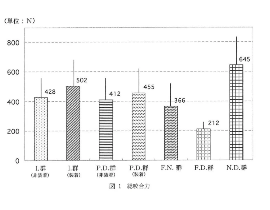 総咬合力は、全部天然歯が一番強く、続いてインプラント、部分入れ歯、総入れ歯でした。
