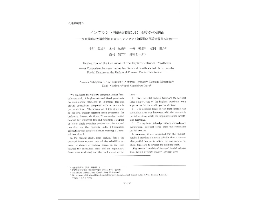 片側奥歯の欠損における補綴治療は、天然歯に近い咬合力の獲得、左右で均衡した咬合力の回復、残存歯の保護という観点から、部分入れ歯よりもインプラントの方が有効であることが示唆されました。